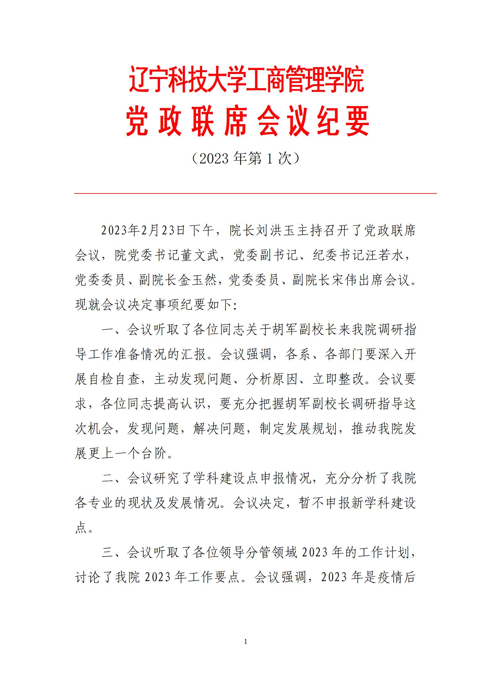 云鼎手机平台工商管理学院党政联席会议纪要(2023年第1次)