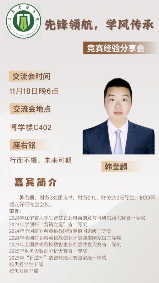 为深入贯彻“先锋领航,学风传承”的理念,帮助同学们扫清竞赛认知障碍,工商管理学院“先锋领航,学风传承”系列宣讲之“竞赛分享交流会”将在11月18日、20日举行。本次活动邀请到两位优秀学长学姐,为大一同学们分享他们在竞赛方面的宝贵经验。