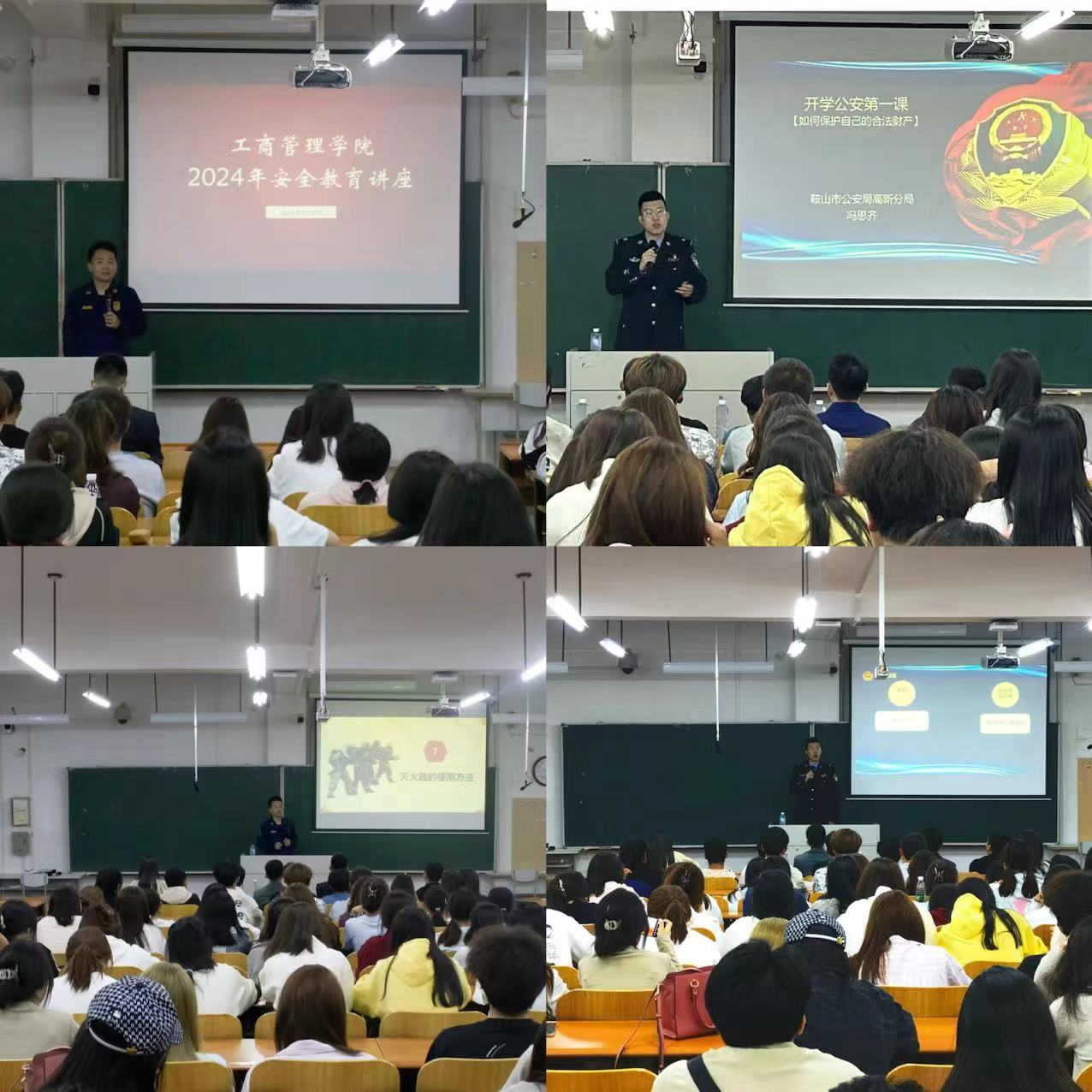 学院于9月29日邀请鞍山市铁东区钢城街消防救援站副站长吴文杰、鞍山市公安局高新公安分局千山派出所冯思齐进校园开展安全教育专题宣讲会。吴文杰警官结合校园火灾的经典案例,详细为学生代表们讲解火灾事故原因、防火相关知识、报火警的正确方法等消防安全知识,同时培训大家灭火器的操作步骤、消火栓与水带的使用方法以及火场逃生术。冯思齐警官为大家主讲了“开学公安第一课”,分享了预防财物被盗相关知识以及电信诈骗的常用方法,并传授大家遇到诈骗怎么办,防止成为电信诈骗的“工具人”等相关知识,提醒大家保持高度安全意识。