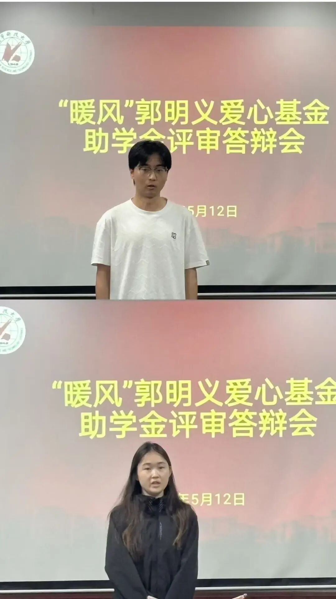 答辩会上,申请学生依次登台,围绕学业成绩、社会实践、志愿服务、家庭经济状况等内容展开个人陈述,全面展现自身成长与奋斗历程。评审团秉持“专业、公正、客观”的原则,对每名学生进行综合评价打分,经过评委集体投票表决,最终确定了13名同学作为2025年“暖风”郭明义爱心基金助学金拟资助人员,并进行公示。