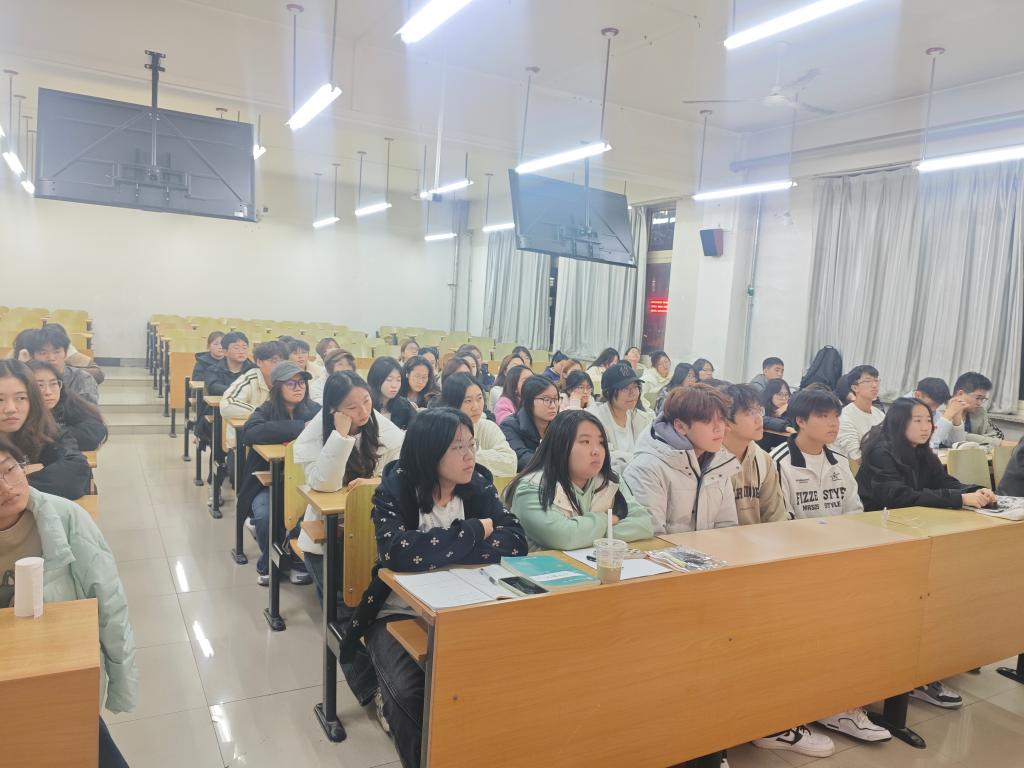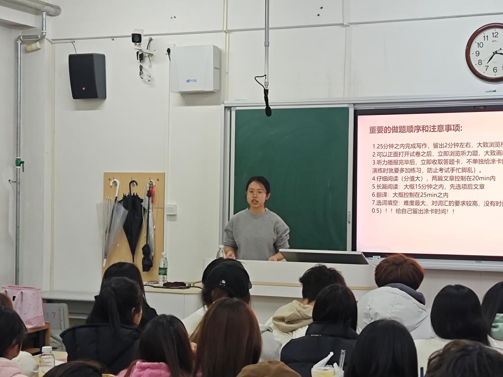 首先,英语教员金融 231 尹红霄作为一次性高分通过四级的“过来人”,深知新生备考痛点。她带来备考全攻略,以题型技巧为核心框架,明确了写作、听力、阅读等模块的时间分配方案,重点讲解了“听力听频一致原则”、阅读“同义替换识别”等实用技巧,强调近5年真题的刷题价值,并建议新生建立专属错题库进行针对性提升,为新生避开备考误区。