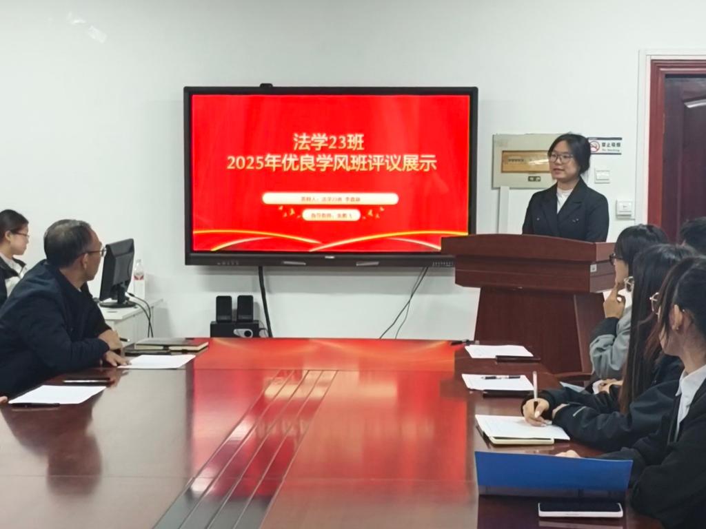 首先进行的是优良学风班答辩,共有来自3个年级的7个班集体参与评比。各班班长围绕思想引领、学业成绩、科创实践、班级文化四个维度,以PPT的形式对班级风采进行展示。从学业提升到文化塑造,从实践成果到创新探索,汇报内容既有数据支撑,也展现了班级建设的温度与创意。学院党委副书记张国华进行点评,他充分肯定了各班班委在学风建设和组织管理方面取得的成绩,并强调“学风建设贵在平时”。他指出,班干部要在日常学习管理中抓实考勤、组建学业帮扶小组、降低挂科率,同时要发挥学生干部的示范引领作用,以点带面形成合力,进一步增强班级凝聚力,为培养高素质经法人才夯实基础。