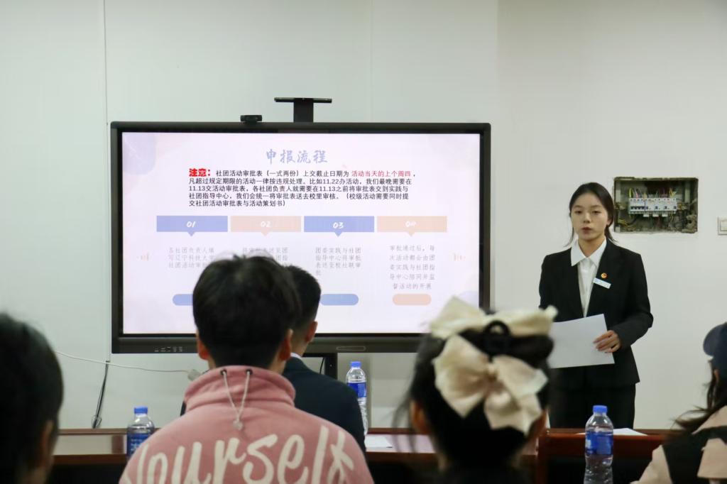 会上,学院团委实践与社团指导中心副主任王美润首先就社团工作培训的具体内容进行讲解,明确了社团管理的基础要点和规范要求。随后,袁萌围绕社团核心工作提出具体要求:各社团活动须严格遵循校院两级审批流程,提前提交《社团活动审批表》;大型活动与小型活动实行分级监督。各社团每学年应组织不少于10次有效活动,鼓励结合专业特色创新活动形式。同时,要规范留存活动资料,合理、合规使用活动经费。