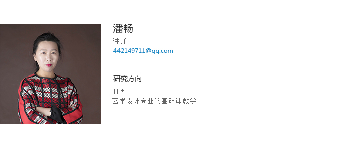 潘畅讲师,文学硕士,本科及研究生毕业于鲁迅美术学院油画系油画专业新古典工作室。2010年至今,在云鼎手机平台建筑与艺术设计学院从事各专业的基础课教学工作。多次举办个人油画作品展;多幅油画作品参加国内外艺术博览会展出并被北京今日美术馆、天津西洋美术馆等艺术机构收藏。2014年师从美国罗德岛美术设计学院任敏教授,旧金山美术学院杰米.摩根教授,研习综合材料绘画技法。作品在全国及省级美术家协会举办的展览中多次获奖,现为辽宁省美术家协会会员;辽宁省青年美术家协会会员。任职期间发表多篇外文检索论文及外文核心论文,并在中文专业核心期刊《美苑》、《美术大观》发表多篇论文及作品。主持云鼎手机平台青年科研基金项目,主持校级教改项目,指导大学生创新创业项目多项及指导学生发表多篇论文;指导学生作品在全国各类大学生比赛中获奖10余次。