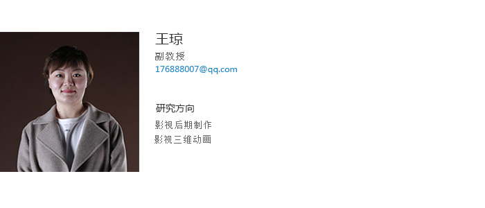王琼,副教授,硕士研究生,毕业于辽宁大学艺术学专业,具有多年辽宁电视台工作经验,先后在国内外期刊公开发表学术论文20余篇,其中EI检索2篇,中文核心5篇;参与撰写国家十二五规划教材;主持省级科研1项,参与省级基金项目多项;获校创新创业教学大赛二等奖;指导学生在全国大学生计算机设计大赛等国内多项专业比赛中获得奖项。