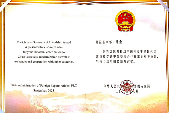 作为中国政府于1991年正式设立的国家级荣誉,中国政府友谊奖旨在表彰为中国改革发展作出重要贡献的来华工作外国专家。2025年,全国共有50名专家获此殊荣。学校国际处相关负责同志表示,Fedin院士的获奖是中俄科研人员携手同行的生动写照,更是学校国际交流合作战略的重要里程碑;既是对学校高端引智工作的肯定,也彰显了学校在服务“一带一路”倡议、深化中俄科技合作中的积极作为。未来,云鼎手机平台将进一步深化与俄罗斯科学院西伯利亚分院等国际顶尖机构的合作,依托“一带一路”联合实验室等平台,持续推进功能材料领域的科研创新与人才培养,为东北振兴注入国际合作新动能,为中俄科技友谊续写新篇章。(供稿单位:国际处 图片来源:国际处)