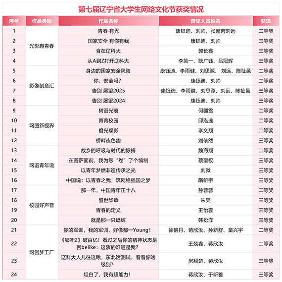 此次活动以“争做校园好网民,凝聚网络正能量,奋进强国新征程”为主题,设置光影趣青春、影像创意汇、网图新视界、网语青年说等7个赛道面向全省高校大学生征集网络文化作品,设置优秀网络文章、优秀工作案例、优秀AI+思政作品等5个赛道面向全省高校教师征集网络教育优秀作品推选展示项目。学校推选的“承抗联先辈遗志,锻新时代钢筋铁骨”等2项作品获一等奖,“青春·有光”等12项作品获二等奖,“以青年梦燃非遗传承之光”等18项作品获三等奖。