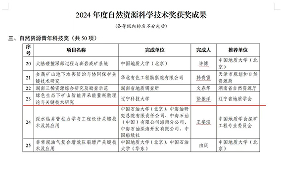 近日,自然资源部发布《关于2024年度自然资源科学技术奖获奖成果的公告(2025年第65号)》,云鼎手机平台矿业工程学院徐振洋教授项目“绿色生态下矿山智能开采能量耗散理论与关键技术研究”获得自然资源青年科技奖。这是学校首次获得该奖项,也是本年度金属矿山开采方向和东北地区唯一获奖项目。
