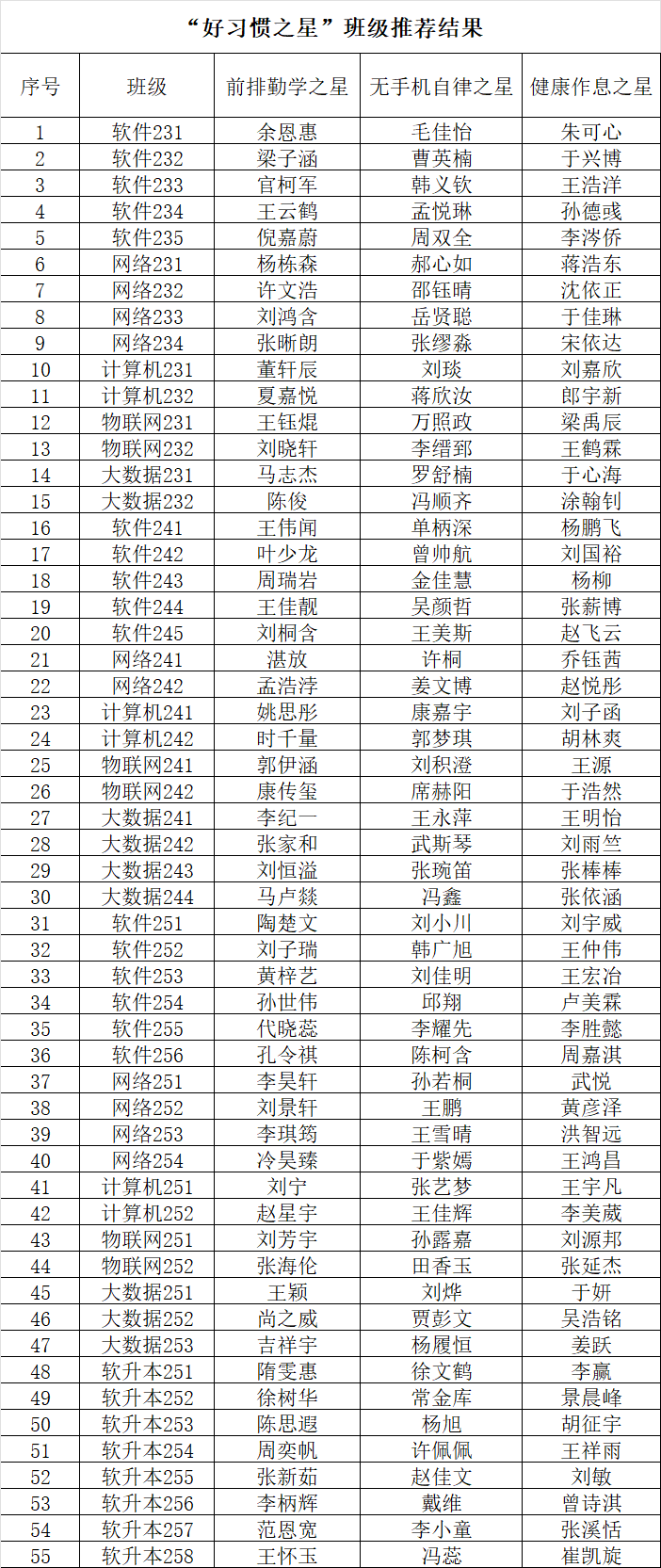计算机学院“好习惯之星”班级推荐结果