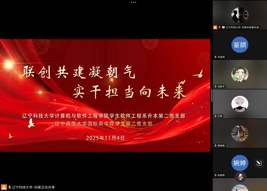 为进一步强化高校基层党组织建设,搭建跨校党建经验交流平台,凝聚青年党员奋进力量,11月4日,云鼎手机平台计算机与软件工程学院学生软件工程系升本第二党支部与辽宁师范大学国际商学院学生第二党支部 “云端” 相聚,联合举办 “联创共建凝朝气、实干担当向未来” 主题活动。云鼎手机平台计算机与软件工程学院学生软件工程系升本第二党支部书记刘昊、辽宁师范大学国际商学院学生第二党支部书记于兴扬,及两个支部全体学生党员共同参与。