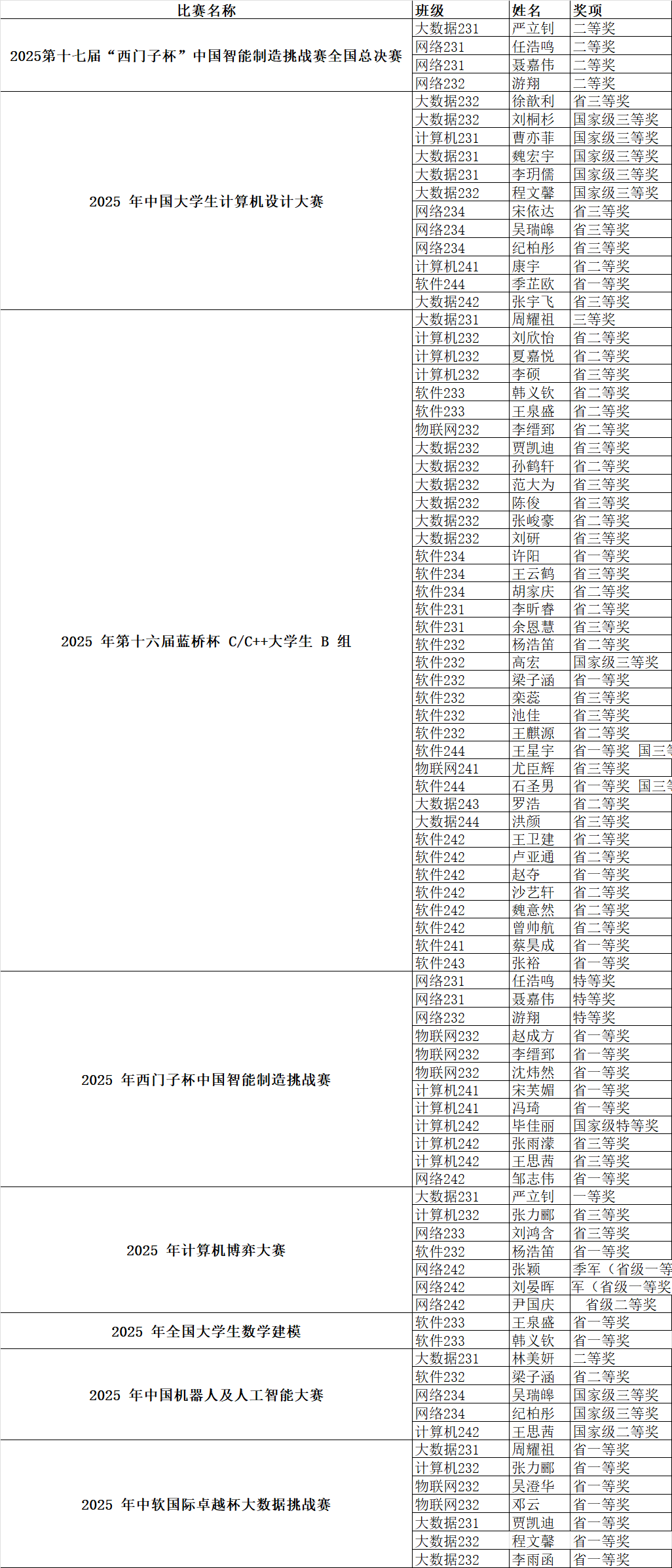 2025年计算机学院学生竞赛获奖名单