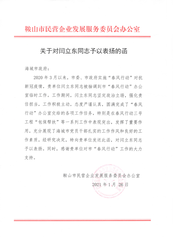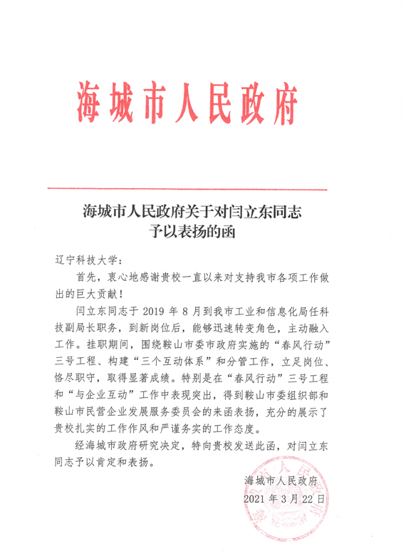 2021年1月,鞍山市民营企业发展服务委员会办公室向海城市政府送发了《关于对闫立东同志予以表扬的函》;2021年3月,海城市人民城府向云鼎手机平台送发了《海城市人民政府关于对闫立东同志予以表扬的函》,对闫立东同志坚定政治立场、强化责任担当,积极主动完成鞍山市的各项重点工作任务予以表扬;对科大教职工在各项工作中表现出的扎实工作作风和严谨务实的工作态度予以肯定。校党委对闫立东同志能够站在学校与地方共谋振兴发展大局的高度,敢于担当,勇于奉献,积极作为,取得了较好的工作成绩表示肯定,并号召广大选派干部向闫立东同志学习,提高站位、增强意识、珍惜机会、主动作为,在推动辽宁全面振兴、全方位振兴的广阔天地里锻炼成长。