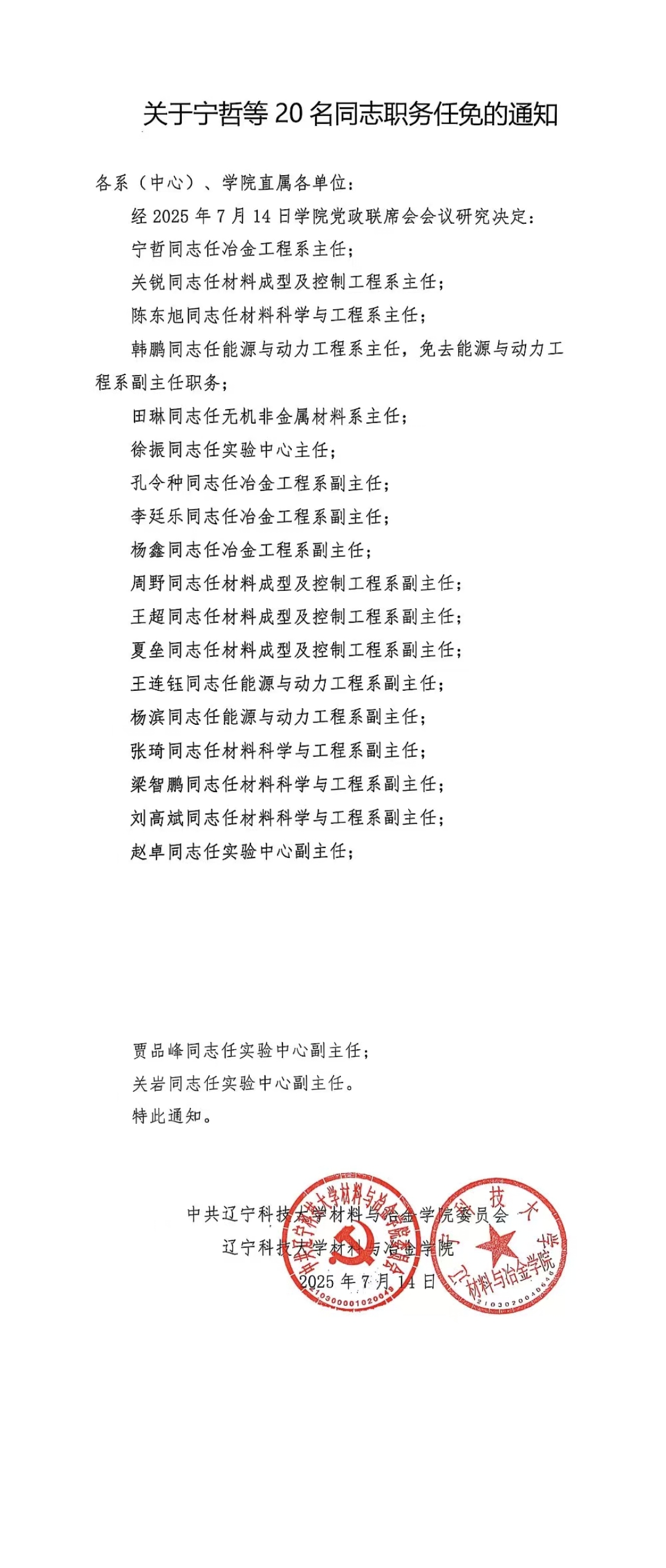 关于宁哲等20名同志职务任免的通知