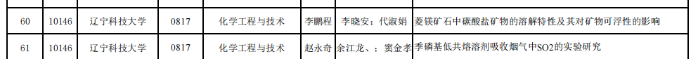 近日,辽宁省教育厅正式发布了2024年辽宁省优秀博士、硕士学位论文评选结果。我院余江龙教授、窦金孝副教授指导的博士研究生赵永奇所撰写的毕业论文《季磷基低共熔溶剂吸收烟气中SO2的实验研究》和李晓安教授、代淑娟教授指导的博士研究生李鹏程所撰写的毕业论文《菱镁矿石中碳酸盐矿物的溶解特性及其对矿物可浮性的影响》分别获评“辽宁省优秀博士学位论文”,充分彰显了学院在研究生培养和学术创新方面的突出实力。