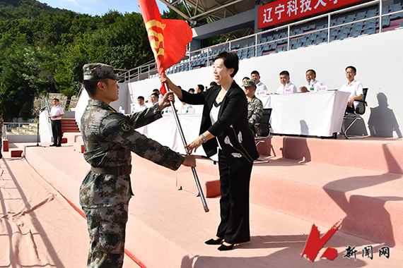开营式上,孙晓华为军训团授团旗。宣传部、党政办公室、后勤与基建管理处、武装部负责人作为校军训团副团长,校团委负责人作为校军训团参谋长分别为各中队授中队旗。武装部负责人在动员讲话时表示,军训是青年学生履行国防义务、接受国防教育的重要形式,是砥砺意志品质、激发爱国热情的关键一课。通过严格的军事训练,青年学生将进一步强化组织观念,磨炼顽强作风,增强团队意识,提升综合素养。希望同学们在挥洒汗水的过程中,深刻体会军人情怀,感悟奉献精神,把个人理想融入国家发展大局。军训教官代表吴文彬、新生代表化学工程学院应化2025.2班李春雨作表态发言,他们一致表示,要不辞辛苦、互敬互爱、相互帮助,确保军训顺利进行。