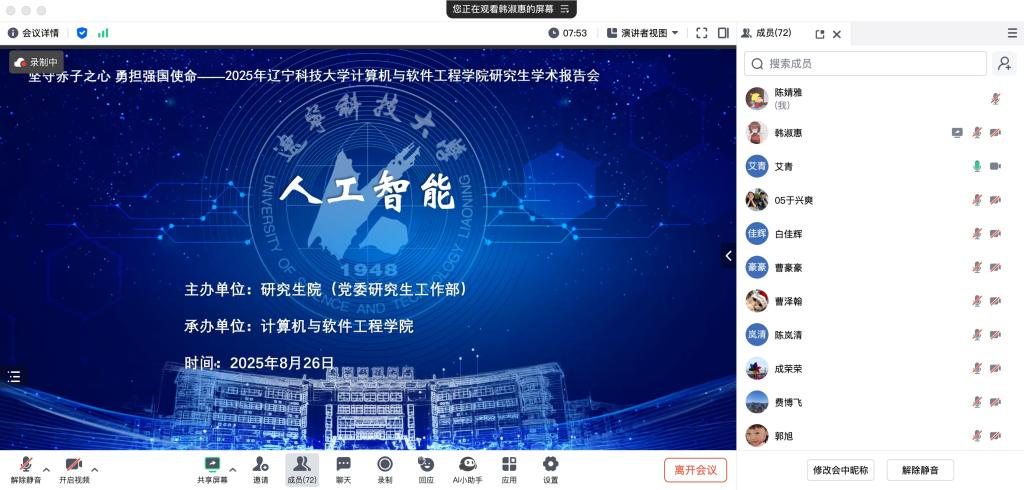 报告环节中,韩淑惠等12位研究生依次登台,围绕人工智能领域的技术突破与实践应用,系统展示了各自的最新研究成果。汇报内容涵盖人工智能算法优化、行业场景落地等多个方向,主讲人不仅清晰呈现了研究的核心框架与实验数据,更针对研究过程中的难点突破、创新思路展开深入解读,充分展现了学院研究生在人工智能领域的科研探索能力与学术思考深度。